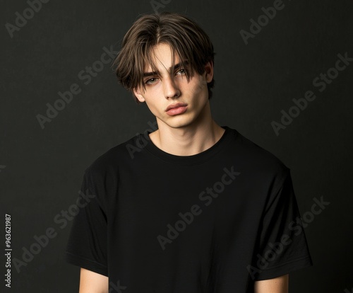 © BrandwayArt, Naklejka premium Male model showcasing casual fashion trends against a dark backdrop
