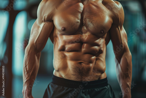 © Alina, Fototapeta premium Male model with abdominal muscles, muscular trainer
