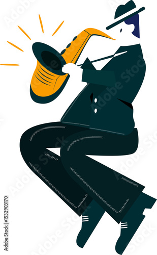 © vectorfusionart, Fototapeta premium Male musician is playing orange saxophone in transparent flat vector, wearing teal suit and fedora