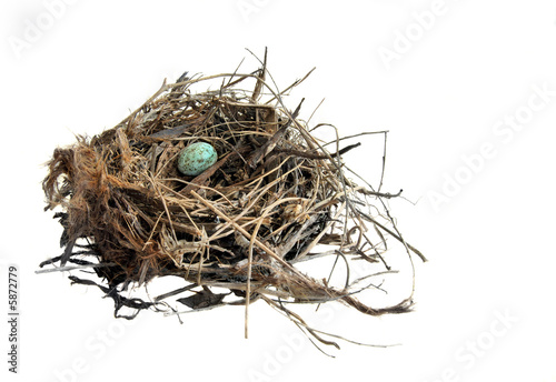 © JMB, Obraz premium Małe niebieskie jajko w gnieździe na białym tle.