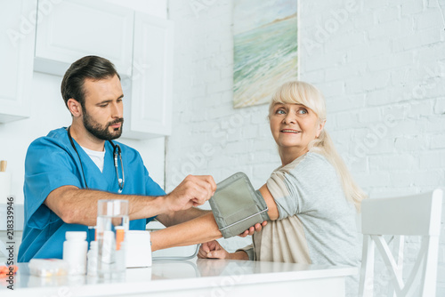 Obraz premium male nurse measuring blood pressure to smiling senior woman