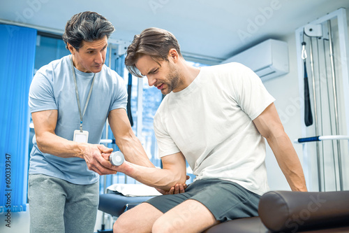 Fototapeta premium Male patient sitting on a couch and exercising his arm