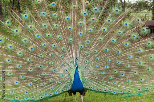 Obraz premium Male Peacock Presenting up close