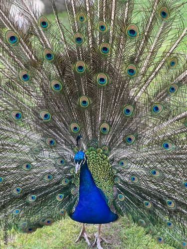 © MariaKitsune, Naklejka premium male peacock with beautiful blue colorful tail on grass background