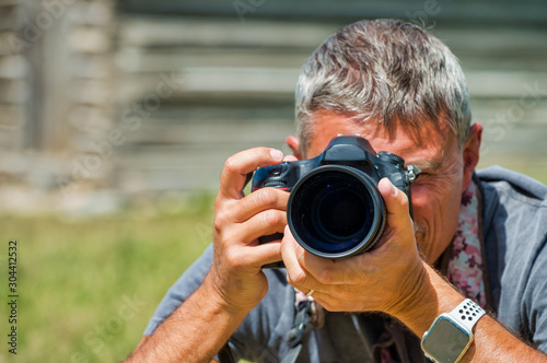 © jovannig, Obraz premium Male photographer observing natural landscape before making pictures