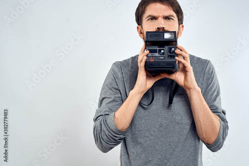Fototapeta premium Male photographer professional camera work Studio Technology modern art light background