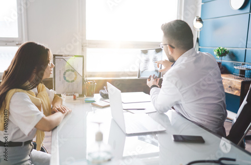 Fototapeta premium Male physician showing chest scan to patient