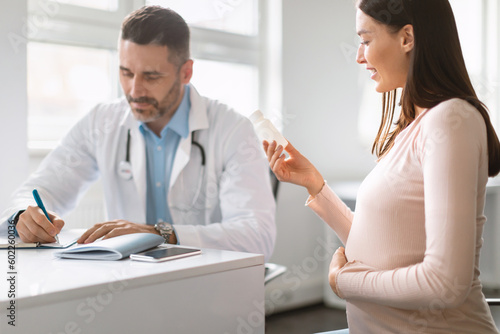 © Prostock-studio, Fototapeta premium Male physician writing on checkup files during visit of pregnant woman, lady holding jar of pills, selective focus