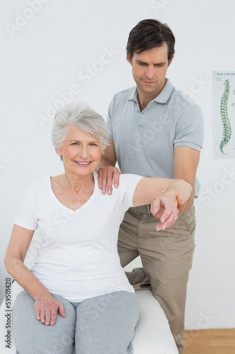Fototapeta premium Male physiotherapist stretching a senior woman's arm
