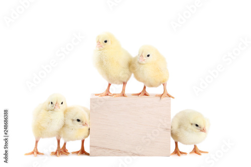 Fototapeta premium Małe pisklęta z drewnianym sześcianem na białym tle