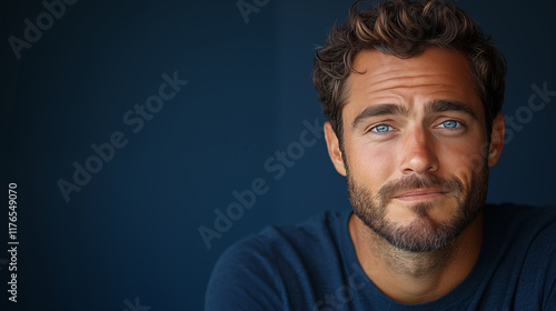 Fototapeta premium Male portrait with blue eyes against dark background highlighting dramatic...