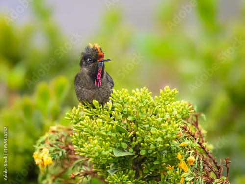 © FotoRequest, Naklejka premium Male Rainbow-bearded Thornbill Perched on Green Bush in Cloud Forest