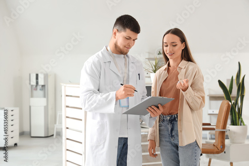 Obraz premium Male receptionist with clipboard and patient in clinic