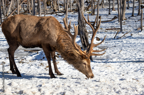 Fototapeta premium Male reindeer (caribou) eating in the snow