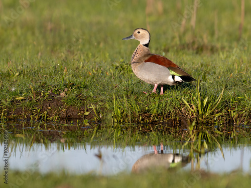 Fototapeta premium Male Ringed Teal with reflection standing on grass