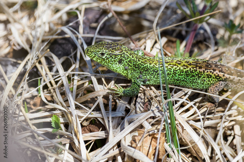 © Thorsten Spoerlein, Naklejka premium Male sand lizard sitting on top of dry grass