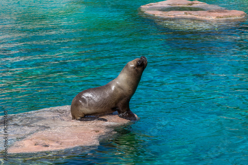 © LuXpics, Naklejka premium Male Sea lion standing on a big sea rock stone with blue water surrounding it