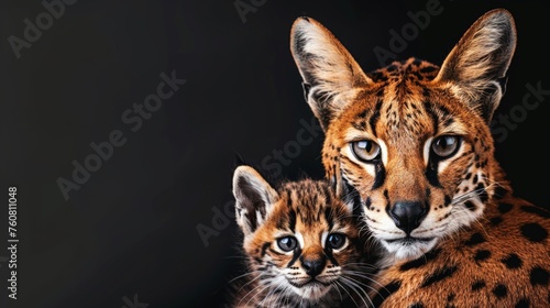 Obraz premium Male serval and serval kitten portrait with empty space on left side for text placement
