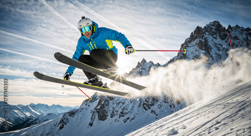 © Milan, Naklejka premium Male skier jumping in the air on a sunny mountain slope. Extreme winter sport action with fresh powder snow