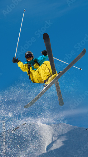 © master1305, Naklejka premium Male skier performing freestyle aerial jump with crossed skis in snow park. Concept of freestyle competition ads, extreme winter campaigns, lifestyle branding and sport promotion. Hand made collage