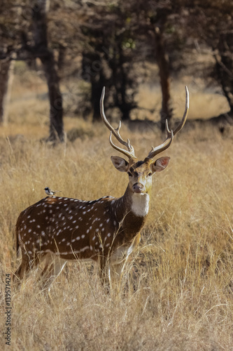 Fototapeta premium Male Spotted deer, facing, in brown grass, Ranthambore National Park, India