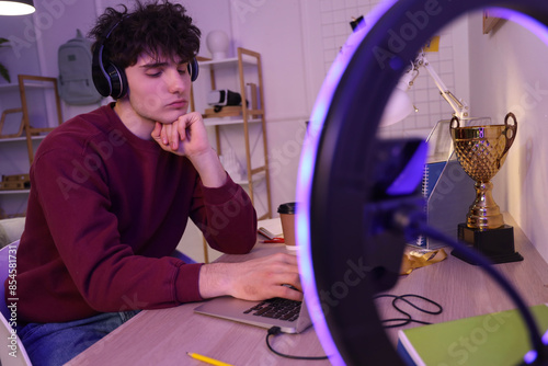 © Pixel-Shot, Fototapeta premium Male student studying while streaming at home in evening