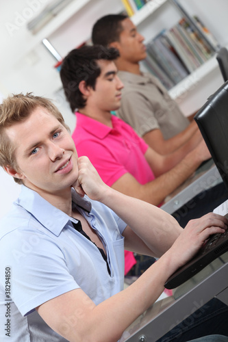 © auremar, Fototapeta premium male students in class working on laptop