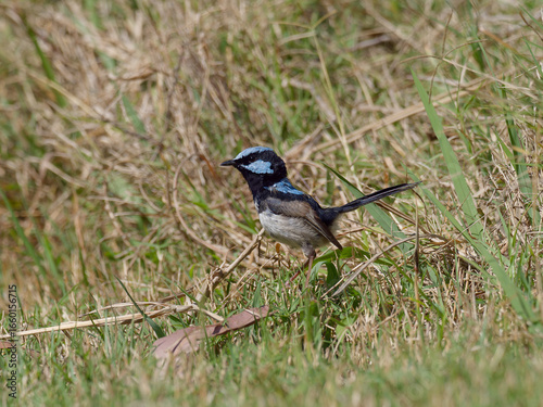 Obraz premium Male Superb Fairywren (Malurus cyaneus) standing on the ground foraging for...