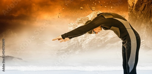 © vectorfusionart, Obraz premium Male swimmer diving against rock formations during sunset