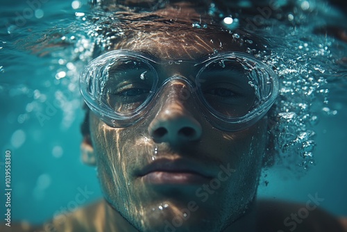 © FrameFlow, Fototapeta premium Male swimmer Under Water in Pool, Generative AI