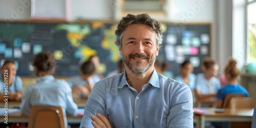 Fototapeta premium Male teacher smiling in classroom with a background of students and books...