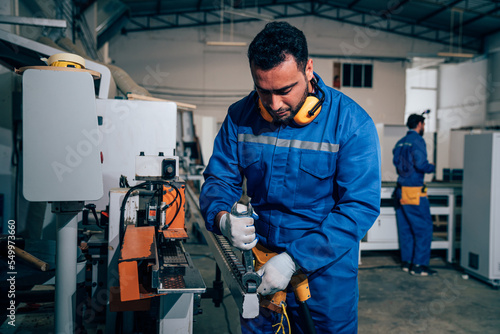 Fototapeta premium Male technician worker checking and repair pressing metal machine at factory,...