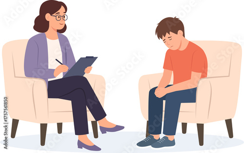 © Oksana, Fototapeta premium Male teenager patient talks with male psychologist. Psychotherapy session. Teen problems. Mental health. Vector flat illustration isolated on the white background.