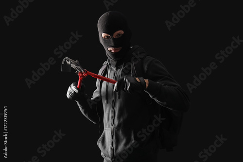 Naklejka premium Male thief breaking lock on black background