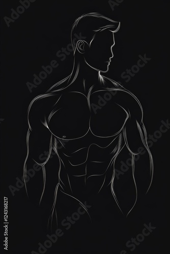 © Dina, Fototapeta premium male torso body white thin silhouette line drawing on black background