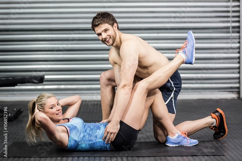© WavebreakMediaMicro, Fototapeta premium Male trainer assisting woman with sit ups