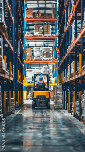 © Synthetica, Fototapeta premium Male warehouse worker working in logistic commercial storage interior retail goods boxes supply. Man storehouse employee manager at work, distribution, industrial sorting and delivery.