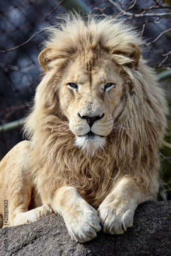 © Mark, Fototapeta premium Male White Lion Looking at you while Lying on a Rock
