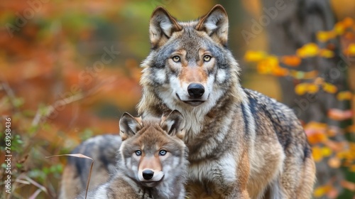 Fototapeta premium Male wolf and cub portrait with space for text, object on side, ideal for search results