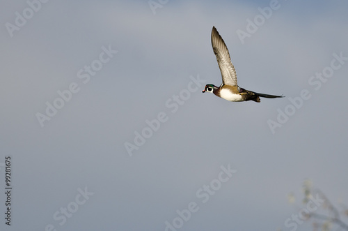 Obraz premium Male Wood Duck Flying in a Blue Sky