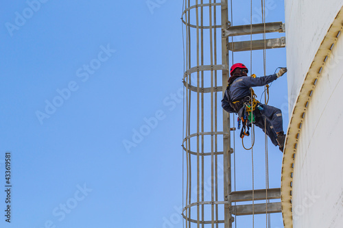 Fototapeta premium Male worker rope access height safety inspection of thickness storage oil and...