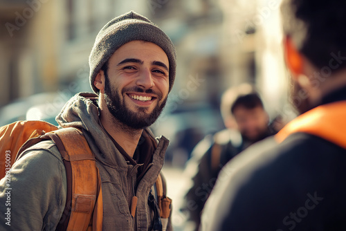 Fototapeta premium Male workers engage in discussion after completing their shift