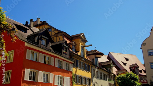 Fototapeta premium malerische Giebel in der Altstadt von Meersburg am Bodensee bei strahlend...