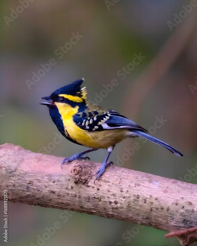 © Lens Legacy, Obraz premium mall Vibrant Black and Yellow Bird Perched on a Tree Branch.