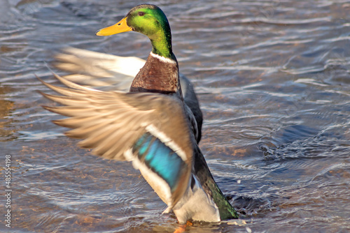 © Ludmila, Obraz premium Mallard drake above the surface of river water in a vertical pose.
