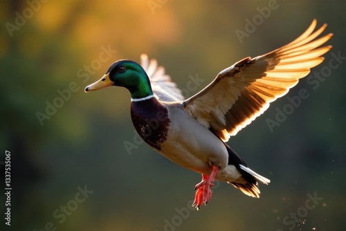 © Wasapol, Obraz premium Mallard drake soaring, sunlight reflecting on feathers, light, golden hour