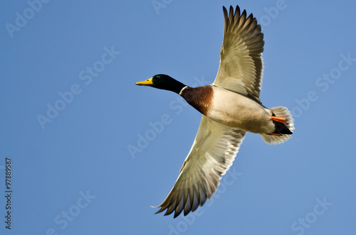 Fototapeta premium Mallard Duck Flying in a Blue Sky
