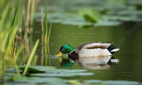 Fototapeta premium Mallard duck foraging in a tranquil marsh