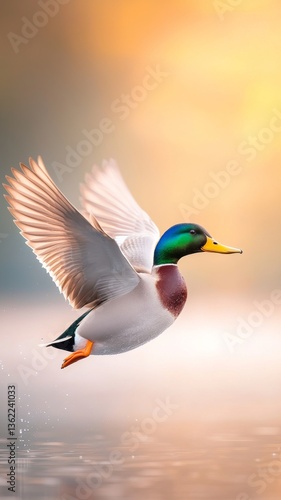 © Sutat, Obraz premium Mallard Duck in Flight at Sunrise Over Calm Water
