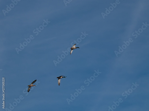 © Piotr, Obraz premium mallard duck in flight in a city park in spain